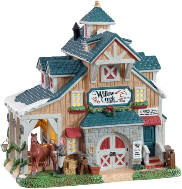 Description : Le centre équestre Willow Creek est un véritable havre de paix pour les cavaliers et leurs montures. Cette élégante écurie possède un toit végétalisé et une magnifique arche en pierre au-dessus des portes principales. D’un côté du bâtiment, deux boxes ouverts, parfaitement éclairés, laissent apparaître un cheval. À l’extérieur, une cavalière, entièrement équipée, prépare un autre cheval.